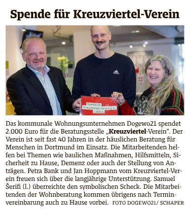 Hier finden Sie den Presseartikel der DOGEWO und das gelungene Foto: https://www.dogewo21.de/presseportal/pressemitteilungen/spende-fuer-den-kreuzviertel-verein-ev
